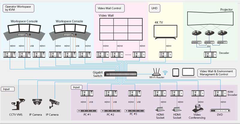AVCiT IP Based KVM System, is built-in all features of video wall control, KVM, matrix switching, visualization, and central control, which is based on a 1 Gigabit Standard Network with distributed and decentralized architecture, mainly used for all-in-one Command Center and Meeting Room Solutions.